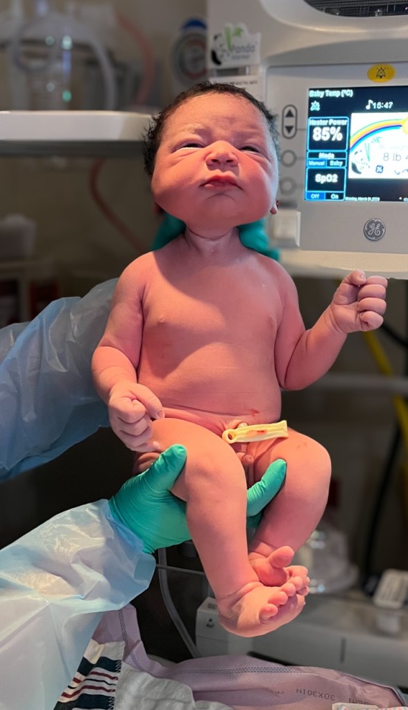 If you have scoliosis, I wouldn’t recommend an epidural unless you’re prepared for it to not really work. They also gave me Pitocin, which made the contractions a lot more intense. I felt every ounce of it and was surprised I didn’t crush Chris’s hand during the worst of it. Thankfully, I only had to push for 20 minutes. It was a wild ride—one moment I was in a lot of pain, and the next I was filled with joy as I welcomed my son into the world. It was a beautiful and chaotic experience all at once.